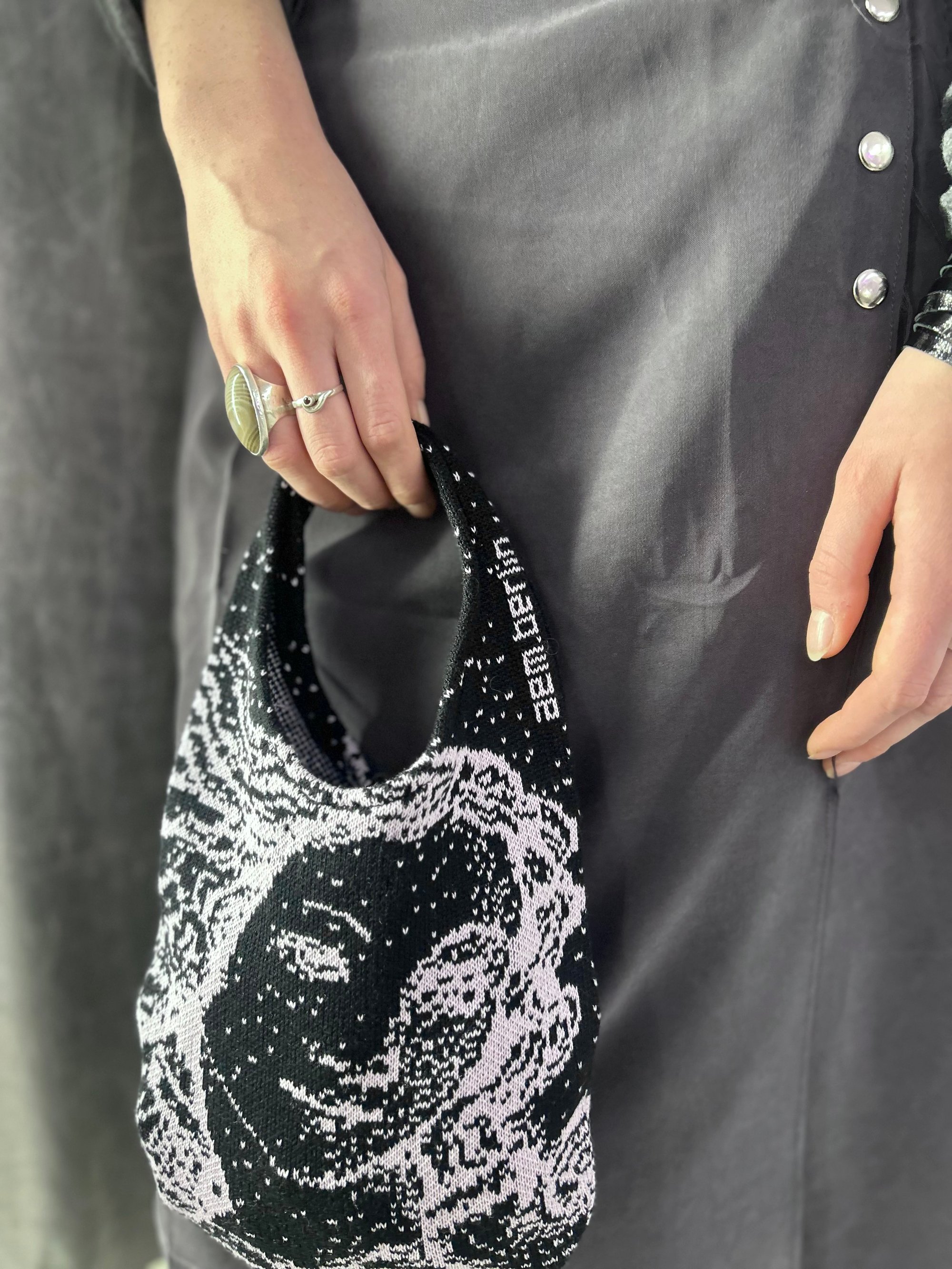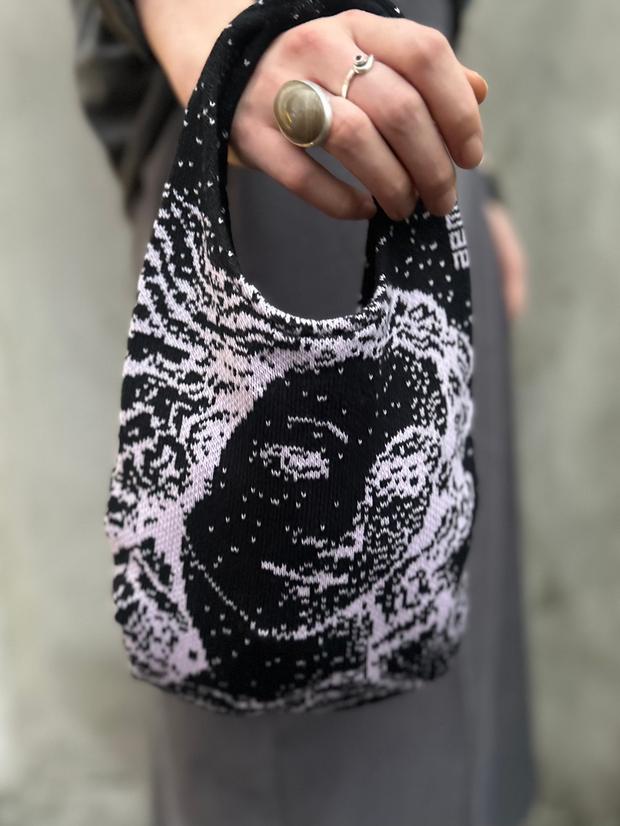 The Studio Knit Mini Bag is designed and knitted in our Berlin studio on our Shima Seiki machine, using our own in-house artwork. Its soft jacquard texture and sculptural shape create a small yet striking accessory that feels like a wearable piece of knit art.