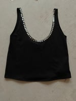 The rounded front neckline is framed with small mother-of-pearl buttons, adding a quiet glow against the black cotton. The back is slightly deeper, revealing the shoulder blades and emphasizing the elegance of movement.