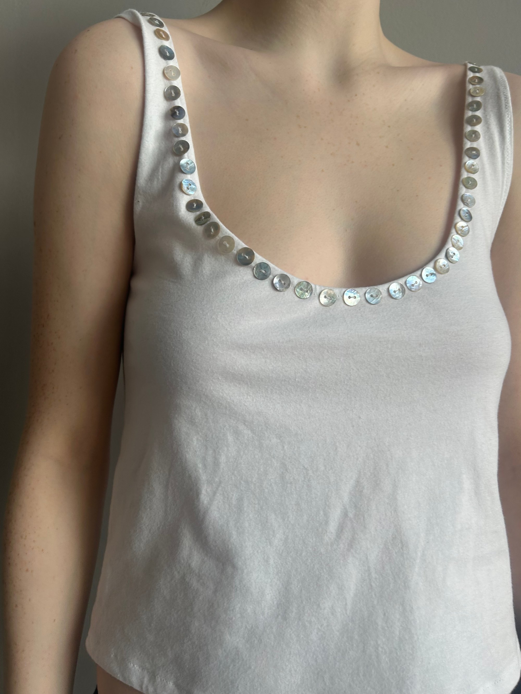 • Mother-of-pearl buttons at the front neckline